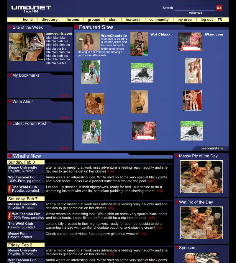 Started in 1998 as a plain collection of text links to various web finds submitted by the very members who frequented the site, we grew within a year to include a chat room, forum, and e-mail list. A good number of people were already aware that wam was "a thing" because of pioneers who had long before released wam magazines, VHS, and web sites. Now folks had another place to meet others who also liked their personal brand of sploshing.